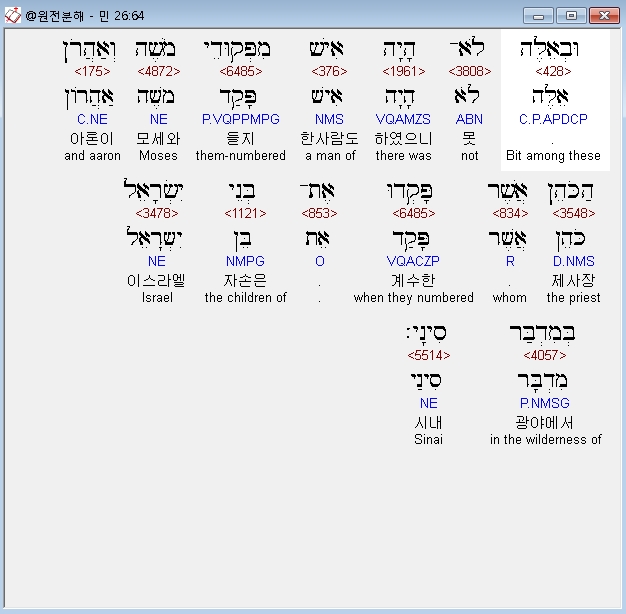 히브리어구약BHS,64 וּבְאֵלֶּה לֹא־הָיָה אִישׁ מִפְּקוּדֵי מֹשֶׁה וְאַהֲרֹן הַכֹּהֵן אֲשֶׁר פָּקְדוּ אֶת־בְּנֵי יִשְׂרָאֵל בְּמִדְבַּר סִינָי׃