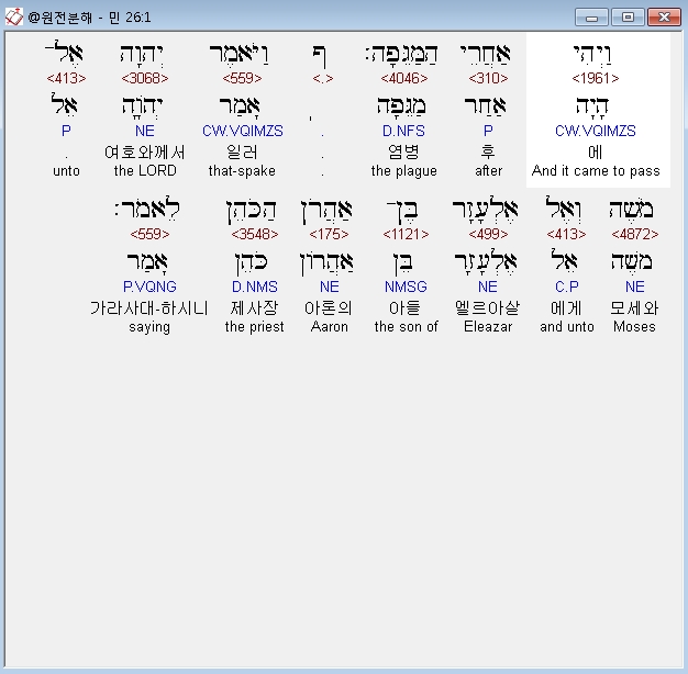 헬라어구약Septuagint,1 και εγενετο μετα την πληγην και ελαλησεν κυριος προς μωυσην και προς ελεαζαρ τον ιερεα λεγων