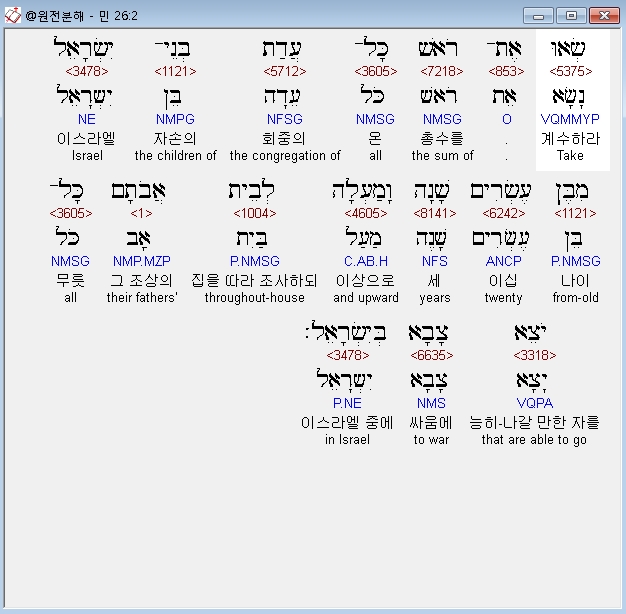 헬라어구약Septuagint,2 λαβε την αρχην πασης συναγωγης υιων ισραηλ απο εικοσαετους και επανω κατ' οικους πατριων αυτων πας ο εκπορευομενος παραταξασθαι εν ισραηλ