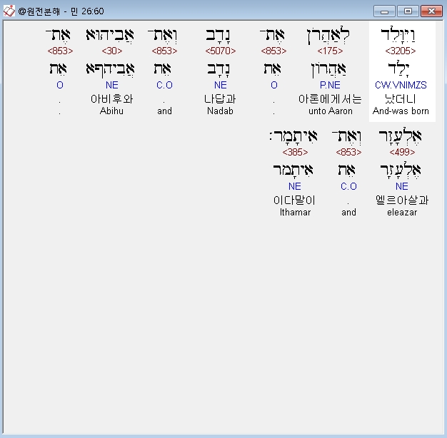 히브리어구약BHS,60 וַיִּוָּלֵד לְאַהֲרֹן אֶת־נָדָב וְאֶת־אֲבִיהוּא אֶת־אֶלְעָזָר וְאֶת־אִיתָמָר׃
