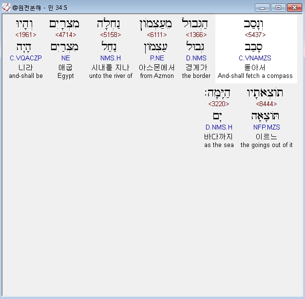 히브리어구약BHS,5 וְנָסַב הַגְּבוּל מֵעַצְמֹון נַחְלָה מִצְרָיִם וְהָיוּ תֹוצְאֹתָיו הַיָּמָּה׃