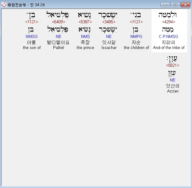 히브리어구약BHS,26 וּלְמַטֵּה בְנֵי־יִשָׂשכָר נָשִׂיא פַּלְטִיאֵל בֶּן־עַזָּן׃