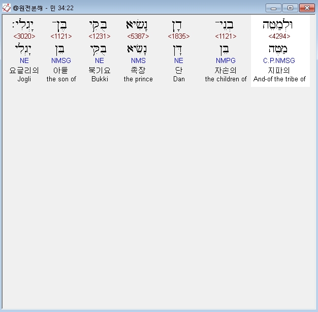 히브리어구약BHS,22 וּלְמַטֵּה בְנֵי־דָן נָשִׂיא בֻּקִּי בֶּן־יָגְלִי׃
