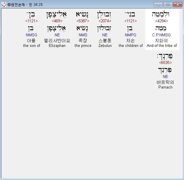 히브리어구약BHS,25 וּלְמַטֵּה בְנֵי־זְבוּלֻן נָשִׂיא אֱלִיצָפָן בֶּן־פַּרְנָךְ׃
