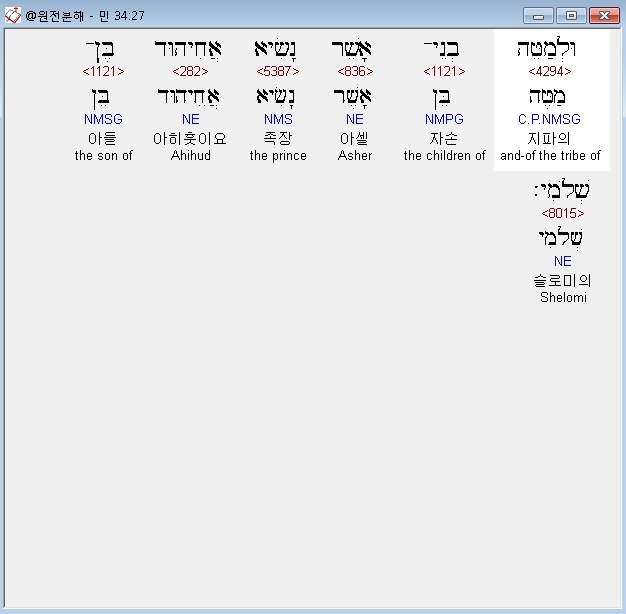 영어NASB,27 "And of the tribe of the sons of Asher a leader, Ahihud the son of Shelomi.