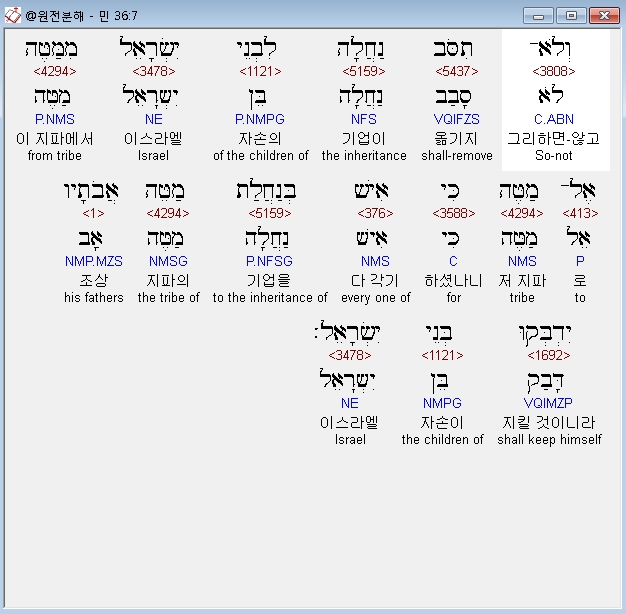 히브리어구약BHS,7 וְלֹא־תִסֹּב נַחֲלָה לִבְנֵי יִשְׂרָאֵל מִמַּטֶּה אֶל־מַטֶּה כִּי אִישׁ בְּנַחֲלַת מַטֵּה אֲבֹתָיו יִדְבְּקוּ בְּנֵי יִשְׂרָאֵל׃