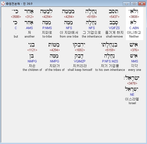 히브리어구약BHS,9 וְלֹא־תִסֹּב נַחֲלָה מִמַּטֶּה לְמַטֶּה אַחֵר כִּי־אִישׁ בְּנַחֲלָתֹו יִדְבְּקוּ מַטֹּות בְּנֵי יִשְׂרָאֵל׃
