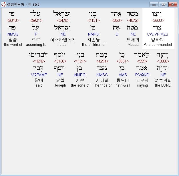 히브리어구약BHS,5 וַיְצַו מֹשֶׁה אֶת־בְּנֵי יִשְׂרָאֵל עַל־פִּי יְהוָה לֵאמֹר כֵּן מַטֵּה בְנֵי־יֹוסֵף דֹּבְרִים׃