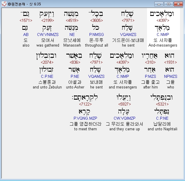헬라어구약Septuagint,35 και αγγελους εξαπεστειλεν εν παντι μανασση και εβοησεν και αυτος οπισω αυτου και εξαπεστειλεν αγγελους εν ασηρ και εν ζαβουλων και εν νεφθαλι και ανεβησαν εις συναντησιν αυτου