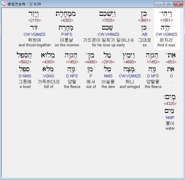 히브리어구약BHS,38 וַיְהִי־כֵן וַיַּשְׁכֵּם מִמָּחֳרָת וַיָּזַר אֶת־הַגִּזָּה וַיִּמֶץ טַל מִן־הַגִּזָּה מְלֹוא הַסֵּפֶל מָיִם׃