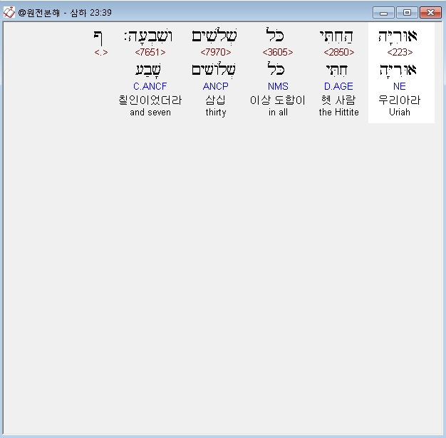 히브리어구약BHS,39 אוּרִיָּה הַחִתִּי כֹּל שְׁלֹשִׁים וְשִׁבְעָה׃ ף