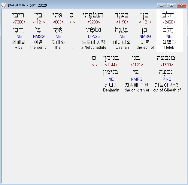 히브리어구약BHS,34 אֱלִיפֶלֶט בֶּן־אֲחַסְבַּי בֶּן־הַמַּעֲכָתִי ס* אֱלִיעָם בֶּן־אֲחִיתֹפֶל הַגִּלֹנִי׃ ס