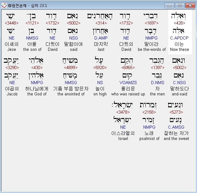 히브리어구약BHS,1 וְאֵלֶּה דִּבְרֵי דָוִד הָאַחֲרֹנִים נְאֻם דָּוִד בֶּן־יִשַׁי וּנְאֻם הַגֶּבֶר הֻקַם עָל מְשִׁיחַ אֱלֹהֵי יַעֲקֹב וּנְעִים זְמִרֹות יִשְׂרָאֵל׃