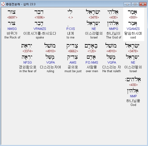 히브리어구약BHS,3 אָמַר אֱלֹהֵי יִשְׂרָאֵל לִי דִבֶּר צוּר יִשְׂרָאֵל מֹושֵׁל בָּאָדָם צַדִּיק מֹושֵׁל יִרְאַת אֱלֹהִים׃