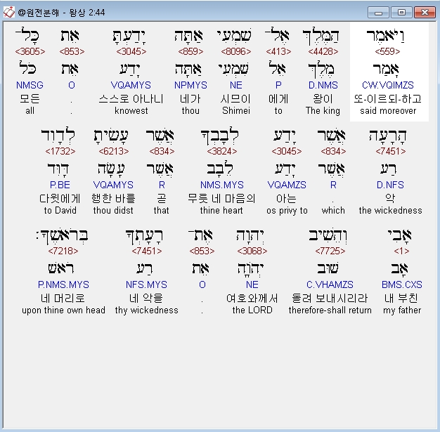 히브리어구약BHS,44 וַיֹּאמֶר הַמֶּלֶךְ אֶל־שִׁמְעִי אַתָּה יָדַעְתָּ אֵת כָּל־הָרָעָה אֲשֶׁר יָדַע לְבָבְךָ אֲשֶׁר עָשִׂיתָ לְדָוִד אָבִי וְהֵשִׁיב יְהוָה אֶת־רָעָתְךָ בְּרֹאשֶׁךָ׃