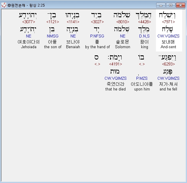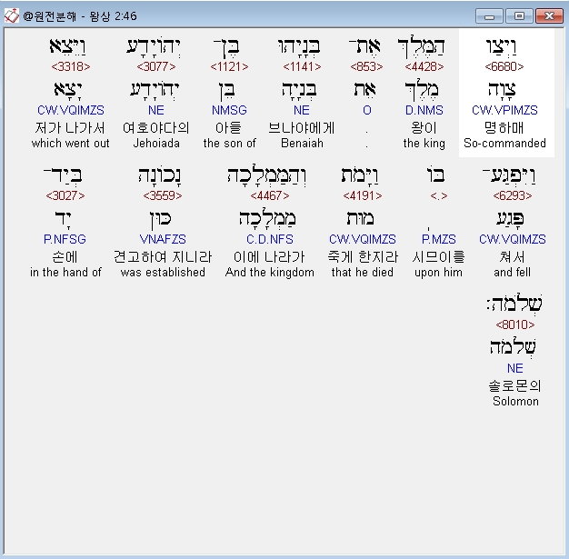 히브리어구약BHS,46 וַיְצַו הַמֶּלֶךְ אֶת־בְּנָיָהוּ בֶּן־יְהֹויָדָע וַיֵּצֵא וַיִּפְגַּע־בֹּו וַיָּמֹת וְהַמַּמְלָכָה נָכֹונָה בְּיַד־שְׁלֹמֹה׃