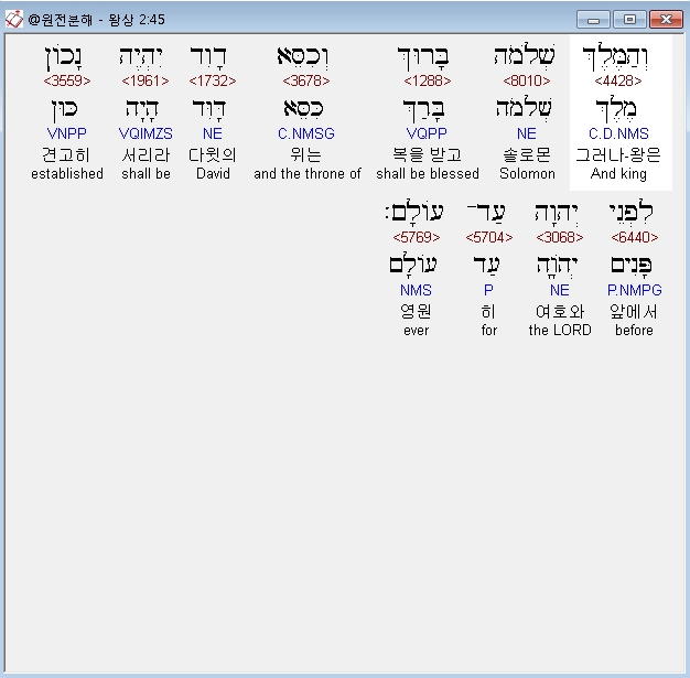 히브리어구약BHS,45 וְהַמֶּלֶךְ שְׁלֹמֹה בָּרוּךְ וְכִסֵּא דָוִד יִהְיֶה נָכֹון לִפְנֵי יְהוָה עַד־עֹולָם׃