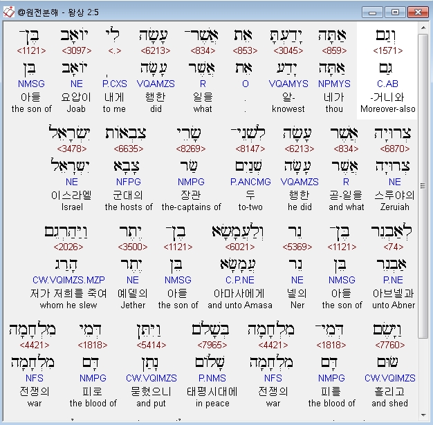 영어MSG,5 "And don't forget what Joab son of Zeruiah did to the two commanders of Israel's army, to Abner son of Ner and to Amasa son of Jether. He murdered them in cold blood, acting in peacetime as if he were at war, and has been stained with that blood ever since.