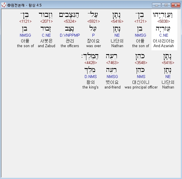 히브리어구약BHS,5 וַעֲזַרְיָהוּ בֶן־נָתָן עַל־הַנִּצָּבִים וְזָבוּד בֶּן־נָתָן כֹּהֵן רֵעֶה הַמֶּלֶךְ׃