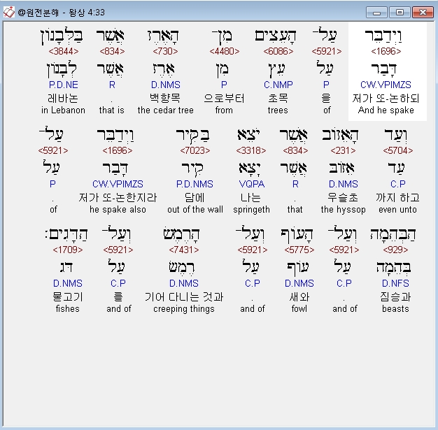 영어NASB,33 And he spoke of trees, from the cedar that is in Lebanon even to the hyssop that grows on the wall; he spoke also of animals and birds and creeping things and fish.