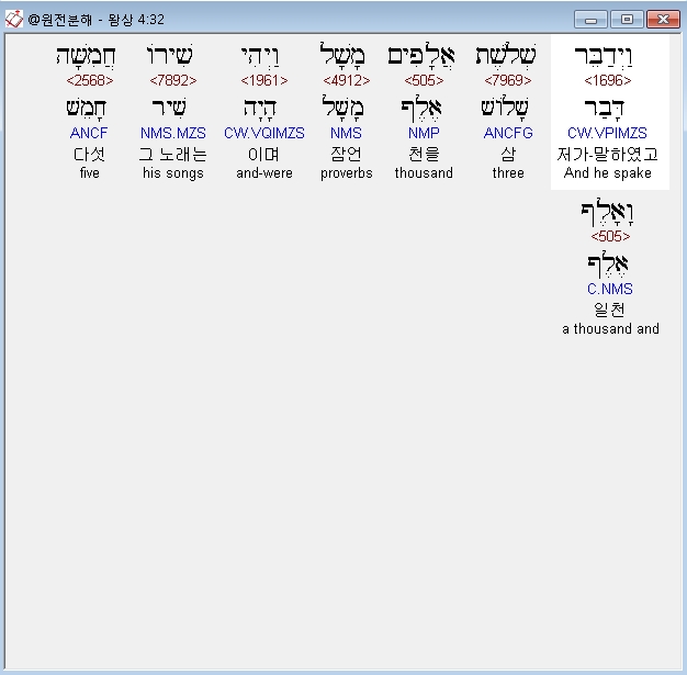 히브리어구약BHS,32 וַיְדַבֵּר שְׁלֹשֶׁת אֲלָפִים מָשָׁל וַיְהִי שִׁירֹו חֲמִשָּׁה וָאָלֶף׃
