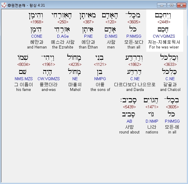 히브리어구약BHS,31 וַיֶּחְכַּם מִכָּל־הָאָדָם מֵאֵיתָן הָאֶזְרָחִי וְהֵימָן וְכַלְכֹּל וְדַרְדַּע בְּנֵי מָחֹול וַיְהִי־שְׁמֹו בְכָל־הַגֹּויִם סָבִיב׃