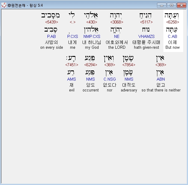 히브리어구약BHS,4 וְעַתָּה הֵנִיחַ יְהוָה אֱלֹהַי לִי מִסָּבִיב אֵין שָׂטָן וְאֵין פֶּגַע רָע׃