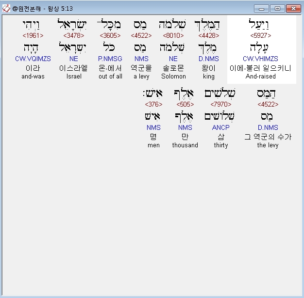 헬라어구약Septuagint,27 και ανηνεγκεν ο βασιλευς φορον εκ παντος ισραηλ και ην ο φορος τριακοντα χιλιαδες ανδρων