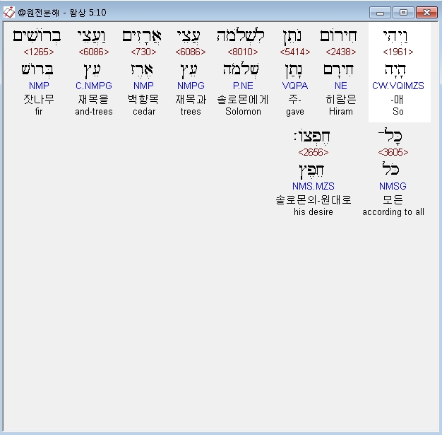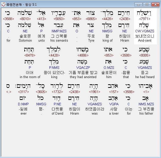 히브리어구약BHS,1 וַיִּשְׁלַח חִירָם מֶלֶךְ־צֹור אֶת־עֲבָדָיו אֶל־שְׁלֹמֹה כִּי שָׁמַע כִּי אֹתֹו מָשְׁחוּ לְמֶלֶךְ תַּחַת אָבִיהוּ כִּי אֹהֵב הָיָה חִירָם לְדָוִד כָּל־הַיָּמִים׃ ס
