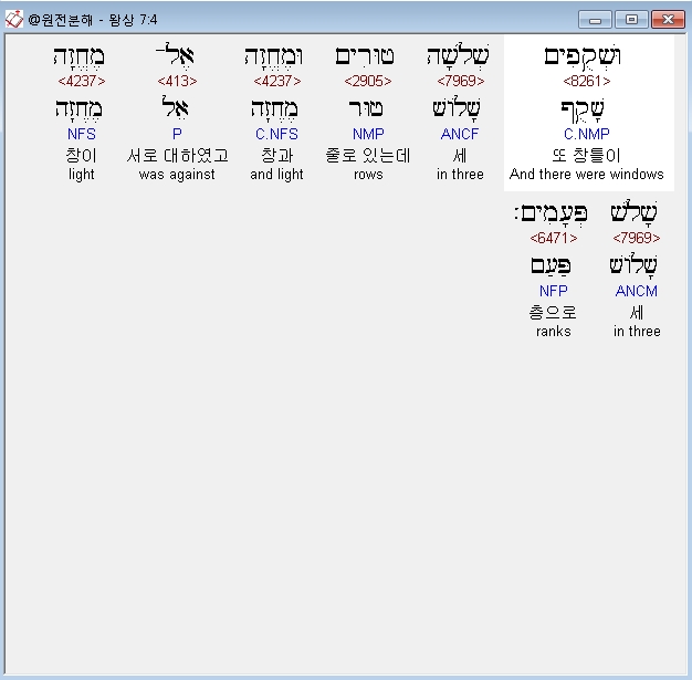 히브리어구약BHS,4 וּשְׁקֻפִים שְׁלֹשָׁה טוּרִים וּמֶחֱזָה אֶל־מֶחֱזָה שָׁלֹשׁ פְּעָמִים׃