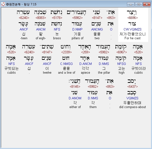 헬라어구약Septuagint,3 και εχωνευσεν τους δυο στυλους τω αιλαμ του οικου οκτωκαιδεκα πηχεις υψος του στυλου και περιμετρον τεσσαρες και δεκα πηχεις εκυκλου αυτον και το παχος του στυλου τεσσαρων δακτυλων τα κοιλωματα και ουτως ο στυλος ο δευτερος