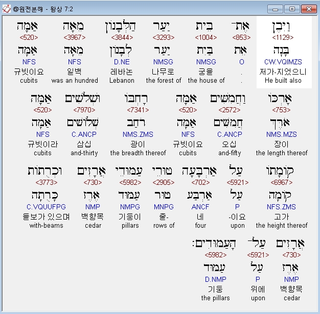 영어NASB,2 And he built the house of the forest of Lebanon; its length was 100 cubits and its width 50 cubits and its height 30 cubits, on four rows of cedar pillars with cedar beams on the pillars.