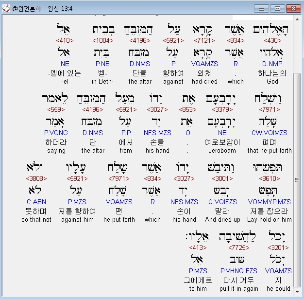 히브리어구약BHS,4 וַיְהִי כִשְׁמֹעַ הַמֶּלֶךְ אֶת־דְּבַר אִישׁ־הָאֱלֹהִים אֲשֶׁר קָרָא עַל־הַמִּזְבֵּחַ בְּבֵית־אֵל וַיִּשְׁלַח יָרָבְעָם אֶת־יָדֹו מֵעַל הַמִּזְבֵּחַ לֵאמֹר תִּפְשֻׂהוּ וַתִּיבַשׁ יָדֹו אֲשֶׁר שָׁלַח עָלָיו וְלֹא יָכֹל לַהֲשִׁיבָהּ אֵלָיו׃
