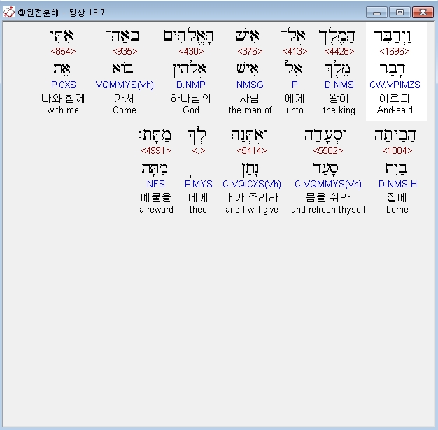 히브리어구약BHS,6 וַיַּעַן הַמֶּלֶךְ וַיֹּאמֶר אֶל־אִישׁ הָאֱלֹהִים חַל־נָא אֶת־פְּנֵי יְהוָה אֱלֹהֶיךָ וְהִתְפַּלֵּל בַּעֲדִי וְתָשֹׁב יָדִי אֵלָי וַיְחַל אִישׁ־הָאֱלֹהִים אֶת־פְּנֵי יְהוָה וַתָּשָׁב יַד־הַמֶּלֶךְ אֵלָיו וַתְּהִי כְּבָרִאשֹׁנָה׃