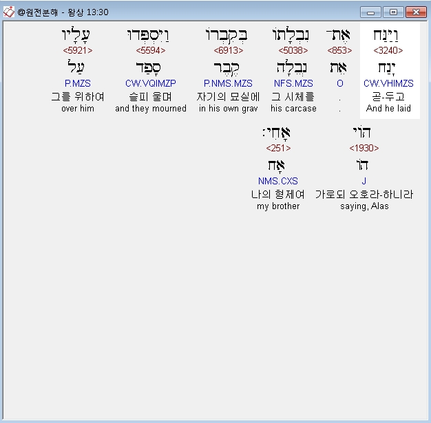 히브리어구약BHS,30 וַיַּנַּח אֶת־נִבְלָתֹו בְּקִבְרֹו וַיִּסְפְּדוּ עָלָיו הֹוי אָחִי׃