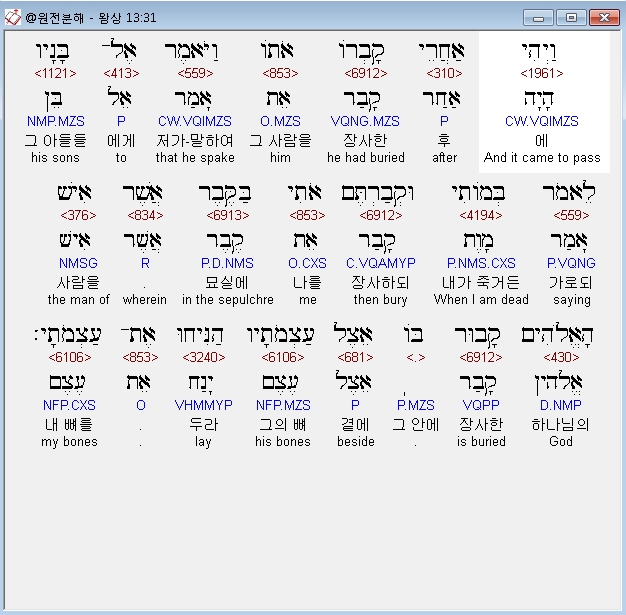 히브리어구약BHS,31 וַיְהִי אַחֲרֵי קָבְרֹו אֹתֹו וַיֹּאמֶר אֶל־בָּנָיו לֵאמֹר בְּמֹותִי וּקְבַרְתֶּם אֹתִי בַּקֶּבֶר אֲשֶׁר אִישׁ הָאֱלֹהִים קָבוּר בֹּו אֵצֶל עַצְמֹתָיו הַנִּיחוּ אֶת־עַצְמֹתָי׃