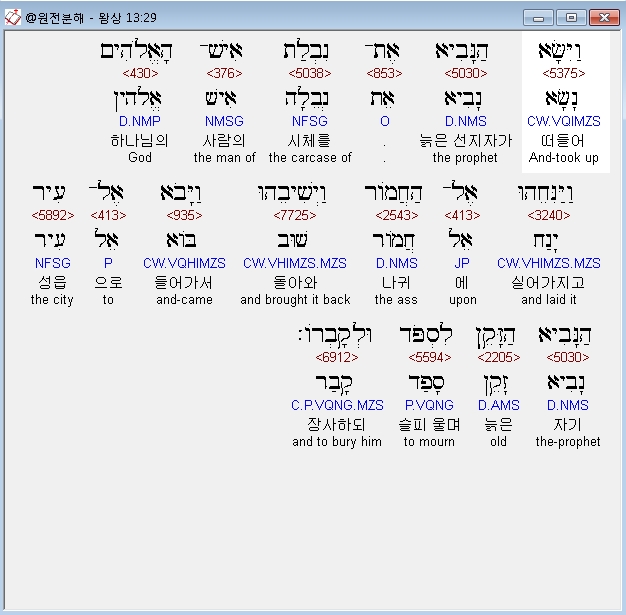 히브리어구약BHS,29 וַיִּשָּׂא הַנָּבִיא אֶת־נִבְלַת אִישׁ־הָאֱלֹהִים וַיַּנִּחֵהוּ אֶל־הַחֲמֹור וַיְשִׁיבֵהוּ וַיָּבֹא אֶל־עִיר הַנָּבִיא הַזָּקֵן לִסְפֹּד וּלְקָבְרֹו׃