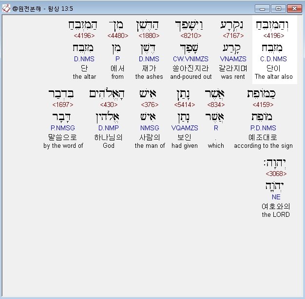히브리어구약BHS,5 וְהַמִּזְבֵּחַ נִקְרָע וַיִּשָּׁפֵךְ הַדֶּשֶׁן מִן־הַמִּזְבֵּחַ כַּמֹּופֵת אֲשֶׁר נָתַן אִישׁ הָאֱלֹהִים בִּדְבַר יְהוָה׃