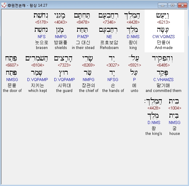 히브리어구약BHS,27 וַיַּעַשׂ הַמֶּלֶךְ רְחַבְעָם תַּחְתָּם מָגִנֵּי נְחֹשֶׁת וְהִפְקִיד עַל־יַד שָׂרֵי הָרָצִים הַשֹּׁמְרִים פֶּתַח בֵּית הַמֶּלֶךְ׃