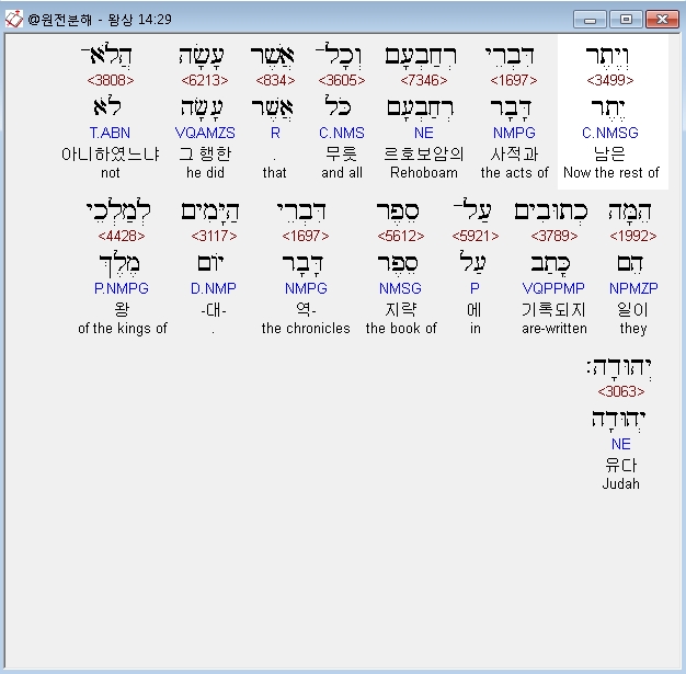 히브리어구약BHS,29 וְיֶתֶר דִּבְרֵי רְחַבְעָם וְכָל־אֲשֶׁר עָשָׂה הֲלֹא־הֵמָּה כְתוּבִים עַל־סֵפֶר דִּבְרֵי הַיָּמִים לְמַלְכֵי יְהוּדָה׃