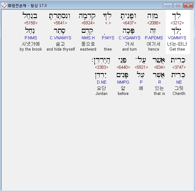 히브리어구약BHS,3 לֵךְ מִזֶּה וּפָנִיתָ לְּךָ קֵדְמָה וְנִסְתַּרְתָּ בְּנַחַל כְּרִית אֲשֶׁר עַל־פְּנֵי הַיַּרְדֵּן׃