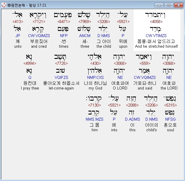 히브리어구약BHS,21 וַיִּתְמֹדֵד עַל־הַיֶּלֶד שָׁלֹשׁ פְּעָמִים וַיִּקְרָא אֶל־יְהוָה וַיֹּאמַר יְהוָה אֱלֹהָי תָּשָׁב נָא נֶפֶשׁ־הַיֶּלֶד הַזֶּה עַל־קִרְבֹּו׃