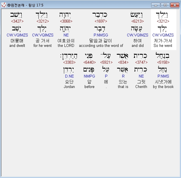 히브리어구약BHS,5 וַיֵּלֶךְ וַיַּעַשׂ כִּדְבַר יְהוָה וַיֵּלֶךְ וַיֵּשֶׁב בְּנַחַל כְּרִית אֲשֶׁר עַל־פְּנֵי הַיַּרְדֵּן׃