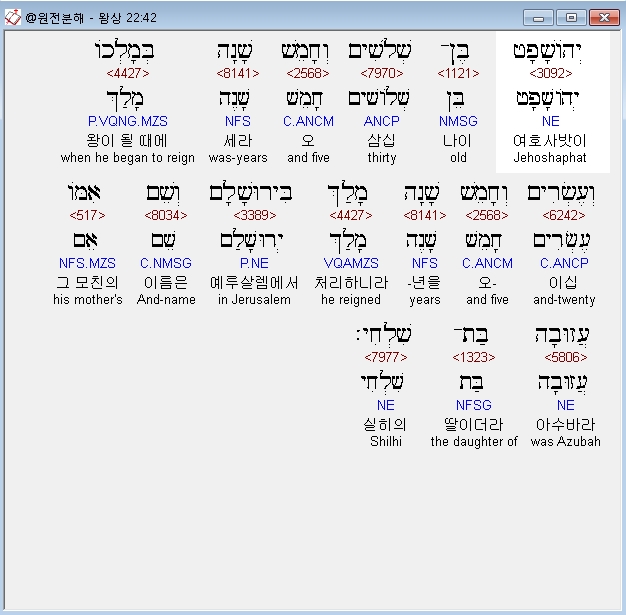 여호사밧 - 이름의 뜻은 '여호와께서 심판하시다'이다. 유다의 제 4대 왕인 그는 25년간(B.C.871-847)을 통치하였다. 비록 몇 가지 실책을 저지르기는 하였지만 여호와를 경외한 여호사밧은 히스기야, 요시야와 더불어 유다의 현왕(賢王) 중 한 명으로 분류된다. 그에 대한 보다 자세한 내용은 41절 주석을 참조하라.