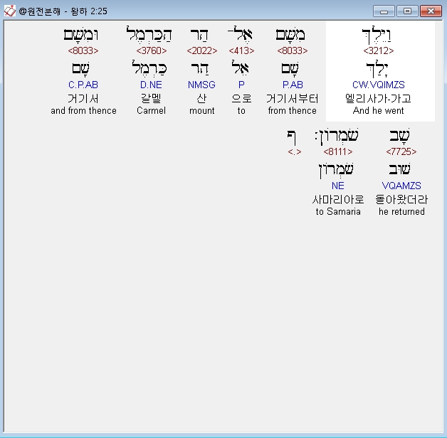 히브리어구약BHS,25 וַיֵּלֶךְ מִשָּׁם אֶל־הַר הַכַּרְמֶל וּמִשָּׁם שָׁב שֹׁמְרֹון׃ ף