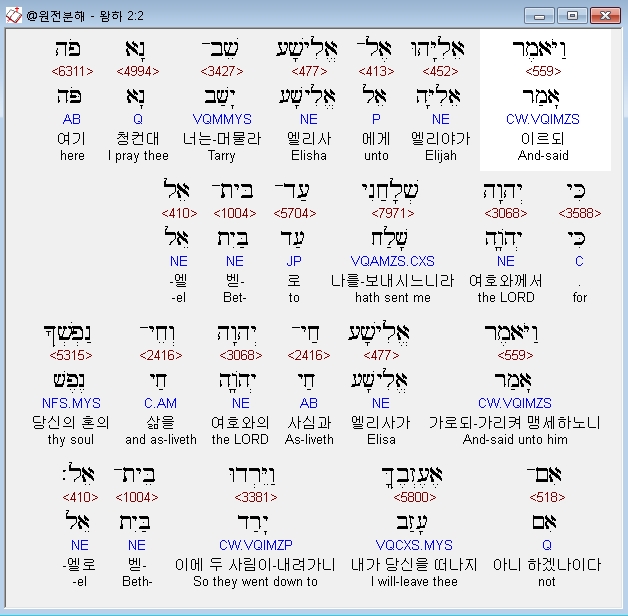 히브리어구약BHS,2 וַיֹּאמֶר אֵלִיָּהוּ אֶל־אֱלִישָׁע שֵׁב־נָא פֹה כִּי יְהוָה שְׁלָחַנִי עַד־בֵּית־אֵל וַיֹּאמֶר אֱלִישָׁע חַי־יְהוָה וְחֵי־נַפְשְׁךָ אִם־אֶעֶזְבֶךָּ וַיֵּרְדוּ בֵּית־אֵל׃