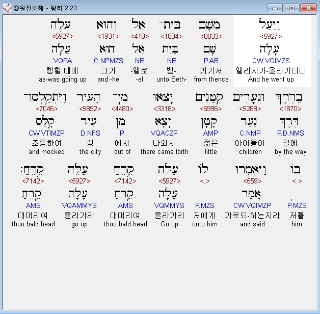 히브리어구약BHS,23 וַיַּעַל מִשָּׁם בֵּית־אֵל וְהוּא עֹלֶה בַדֶּרֶךְ וּנְעָרִים קְטַנִּים יָצְאוּ מִן־הָעִיר וַיִּתְקַלְּסוּ־בֹו וַיֹּאמְרוּ לֹו עֲלֵה קֵרֵחַ עֲלֵה קֵרֵחַ׃