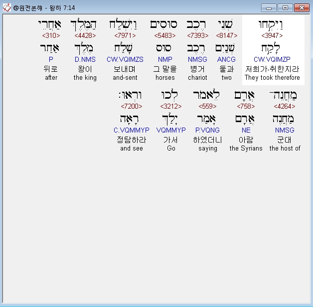 히브리어구약BHS,14 וַיִּקְחוּ שְׁנֵי רֶכֶב סוּסִים וַיִּשְׁלַח הַמֶּלֶךְ אַחֲרֵי מַחֲנֵה־אֲרָם לֵאמֹר לְכוּ וּרְאוּ׃
