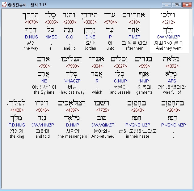 히브리어구약BHS,15 וַיֵּלְכוּ אַחֲרֵיהֶם עַד־הַיַּרְדֵּן וְהִנֵּה כָל־הַדֶּרֶךְ מְלֵאָה בְגָדִים וְכֵלִים אֲשֶׁר־הִשְׁלִיכוּ אֲרָם [כ= בְּהֵחָפְזָם] [ק= בְּחָפְזָם] וַיָּשֻׁבוּ הַמַּלְאָכִים וַיַּגִּדוּ לַמֶּלֶךְ׃
