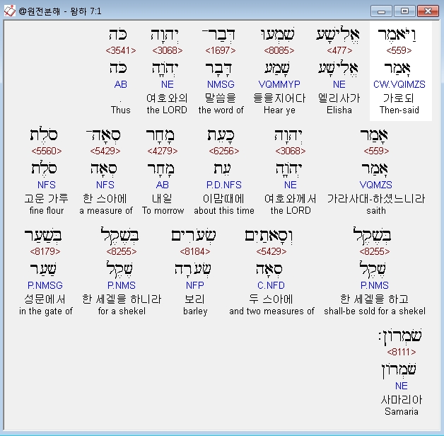 히브리어구약BHS,1 וַיֹּאמֶר אֱלִישָׁע שִׁמְעוּ דְּבַר־יְהוָה כֹּה אָמַר יְהוָה כָּעֵת מָחָר סְאָה־סֹלֶת בְּשֶׁקֶל וְסָאתַיִם שְׂעֹרִים בְּשֶׁקֶל בְּשַׁעַר שֹׁמְרֹון׃
